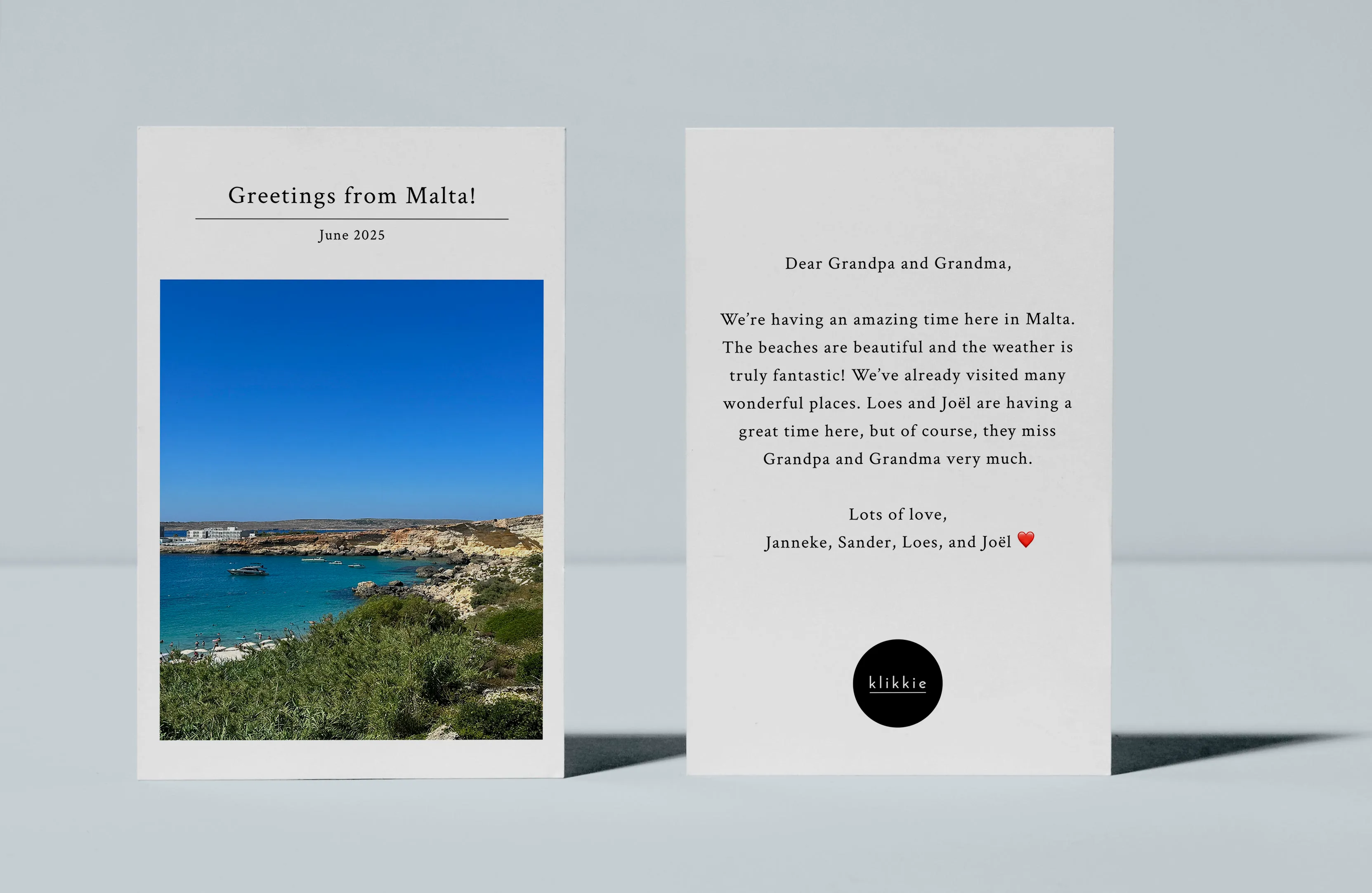 Überrasche deine Liebsten mit einer personalisierten Fotokarte und lass sie an deinen Lieblingsmomenten und schönsten Urlaubsschnappschüssen teilhaben! Die Karte ist aus stabilem Papier gefertigt und zeigt ein hochwertiges Foto mit leuchtenden Farben. Mit einem unserer drei sorgfältig ausgewählten Designs kannst du ganz einfach eine stilvolle Karte erstellen, die schnell zu deinem Empfänger nach Hause geliefert wird.